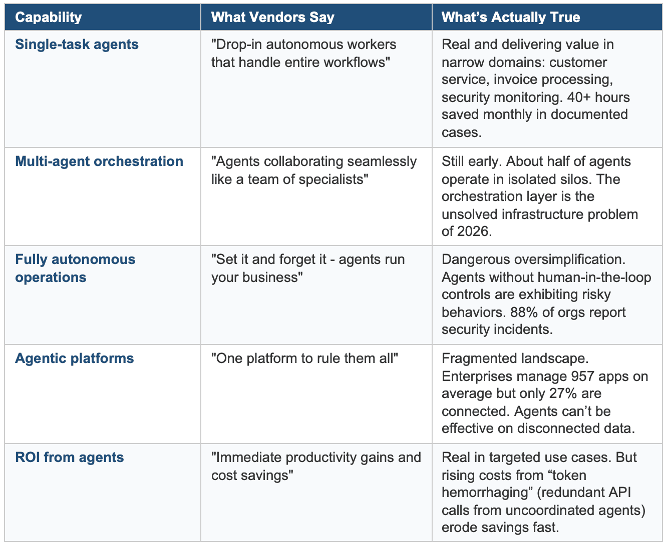 The bottom line: Single-task agents in well-defined domains are delivering real value today. Multi-agent systems, autonomous operations, and enterprise-wide agentic platforms are 6–12 months from being production-ready for most organizations.