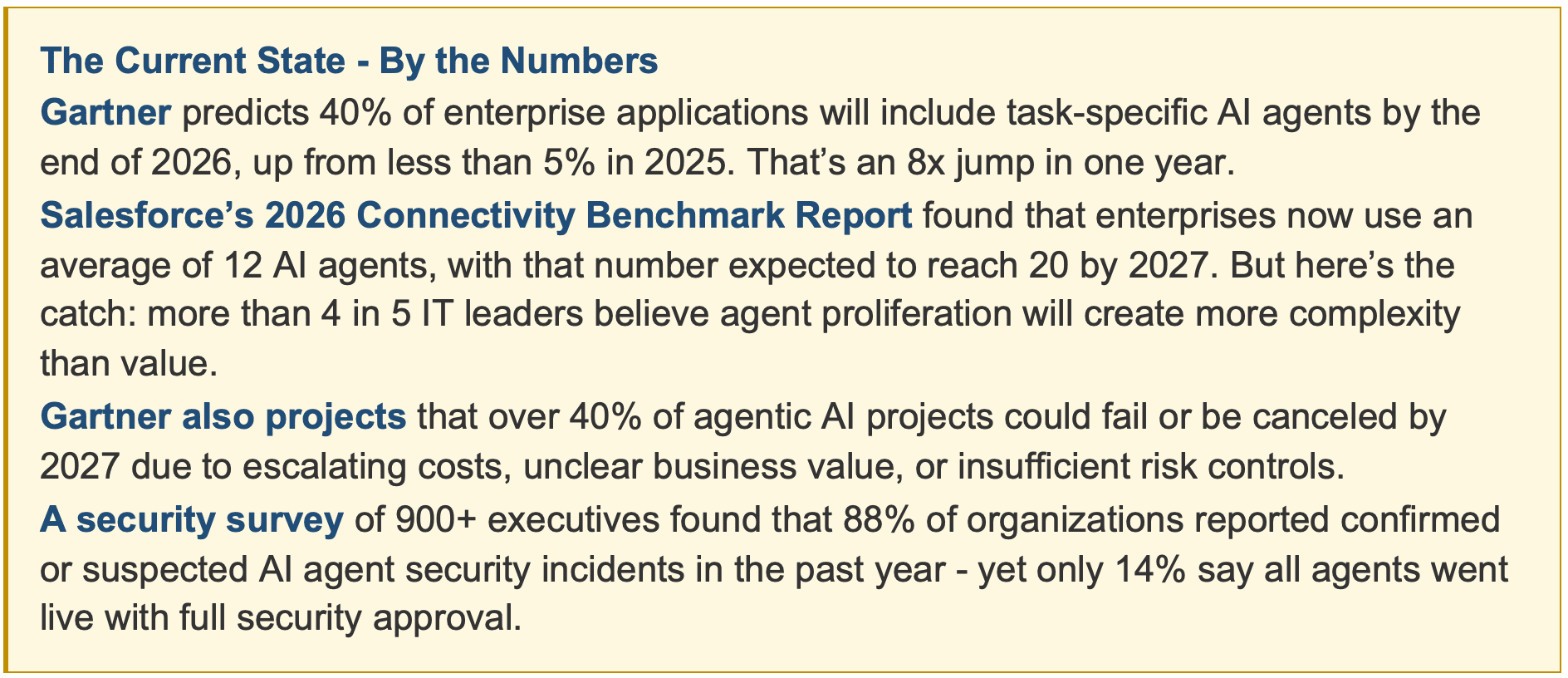 Read those numbers together and a clear picture emerges: adoption is accelerating rapidly, but governance, security, and integration are not keeping pace. We’re building faster than we can control.