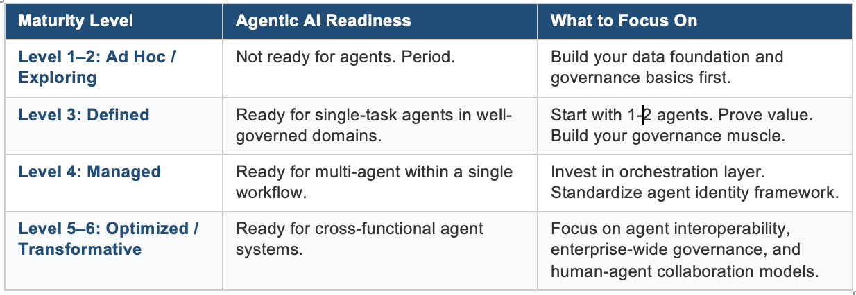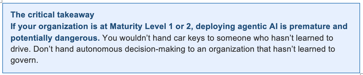 If you read my earlier post, you’ll remember the GenAI Maturity Framework with six levels of organizational maturity. Here’s where agentic AI fits: