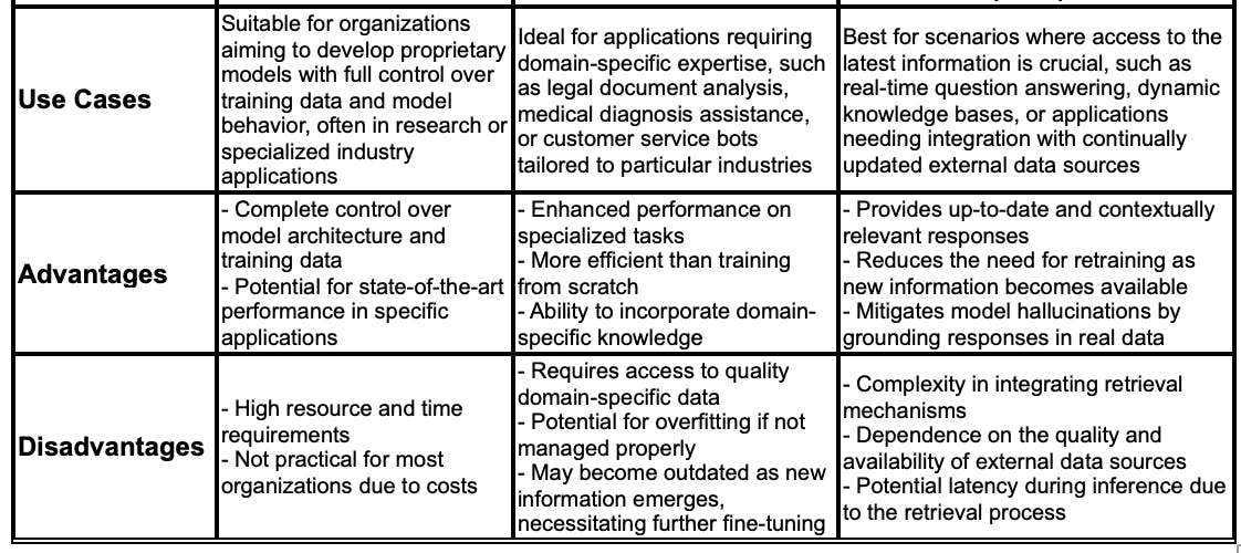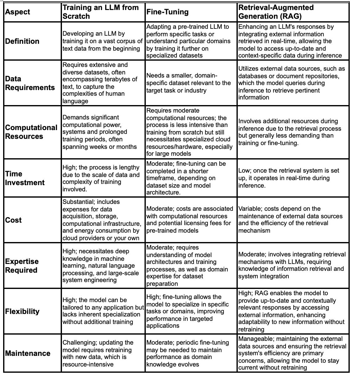 Here’s a quick comparison of the three primary approaches, training from scratch, fine-tuning, and Retrieval-Augmented Generation (RAG), to help you choose the best path for embedding your organization’s unique domain knowledge into a Large Language Model (LLM).