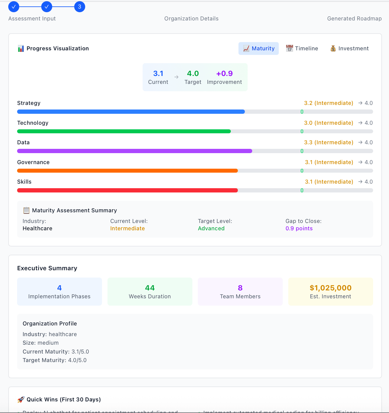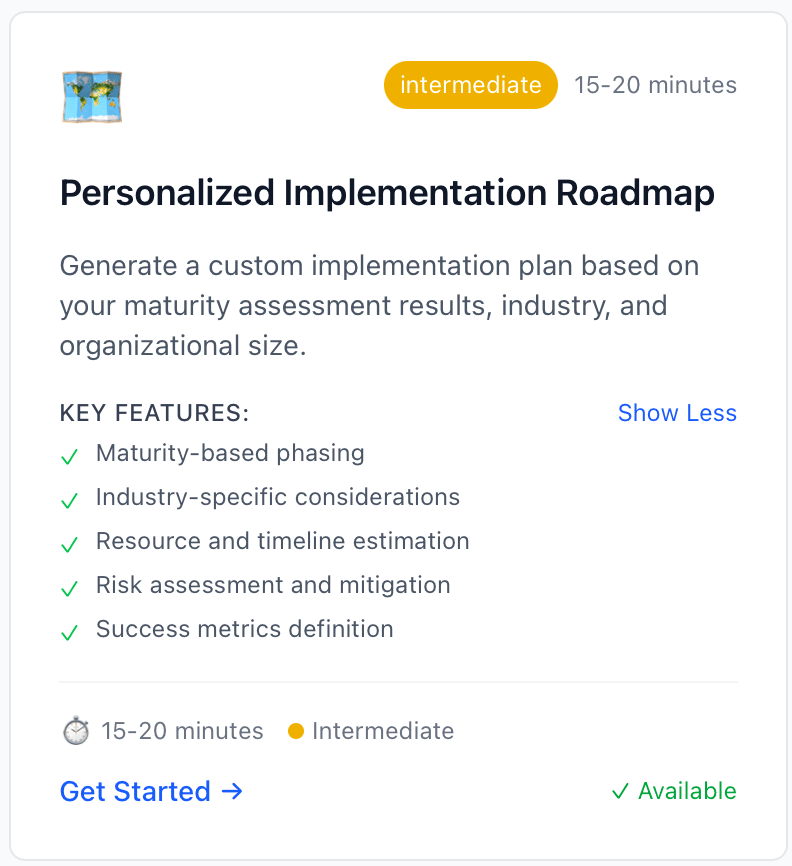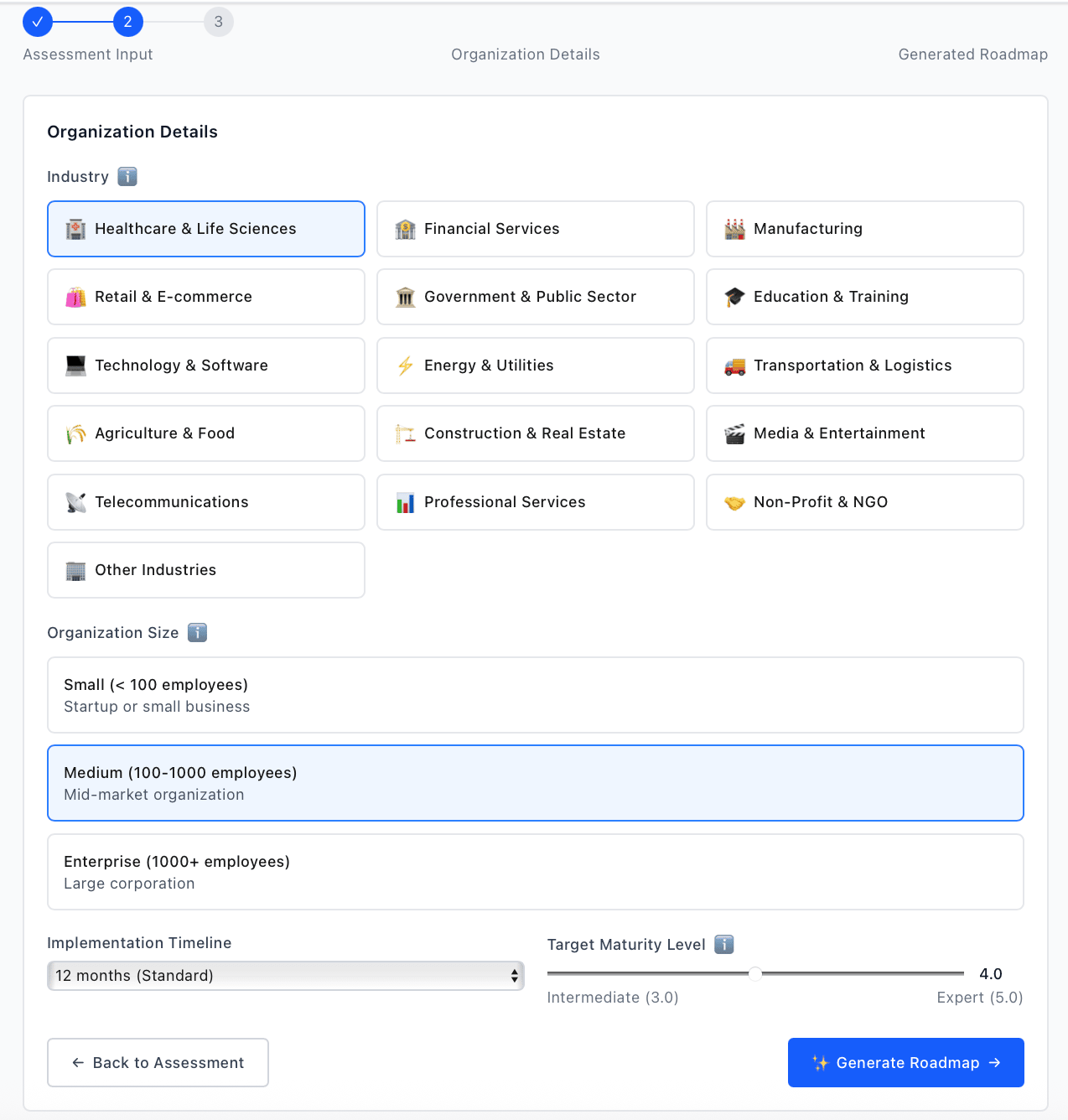 That’s why I was looking for something easy to visualize and put together, and here is the result of these thoughts with the actions, so you can create a Personalized Implementation Roadmap, a tool that translates your maturity results into a step-by-step plan, tuned to your industry, organization size, and resource level.