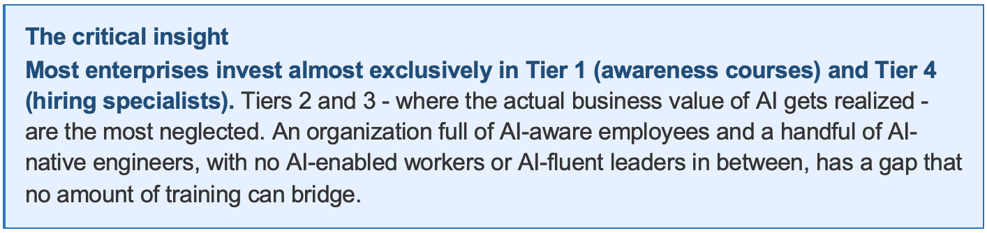 This week, I want to break down why the gap persists, introduce a framework for thinking about AI skills across the enterprise, and give you a concrete playbook for closing it, not with more courses, but with structural change.