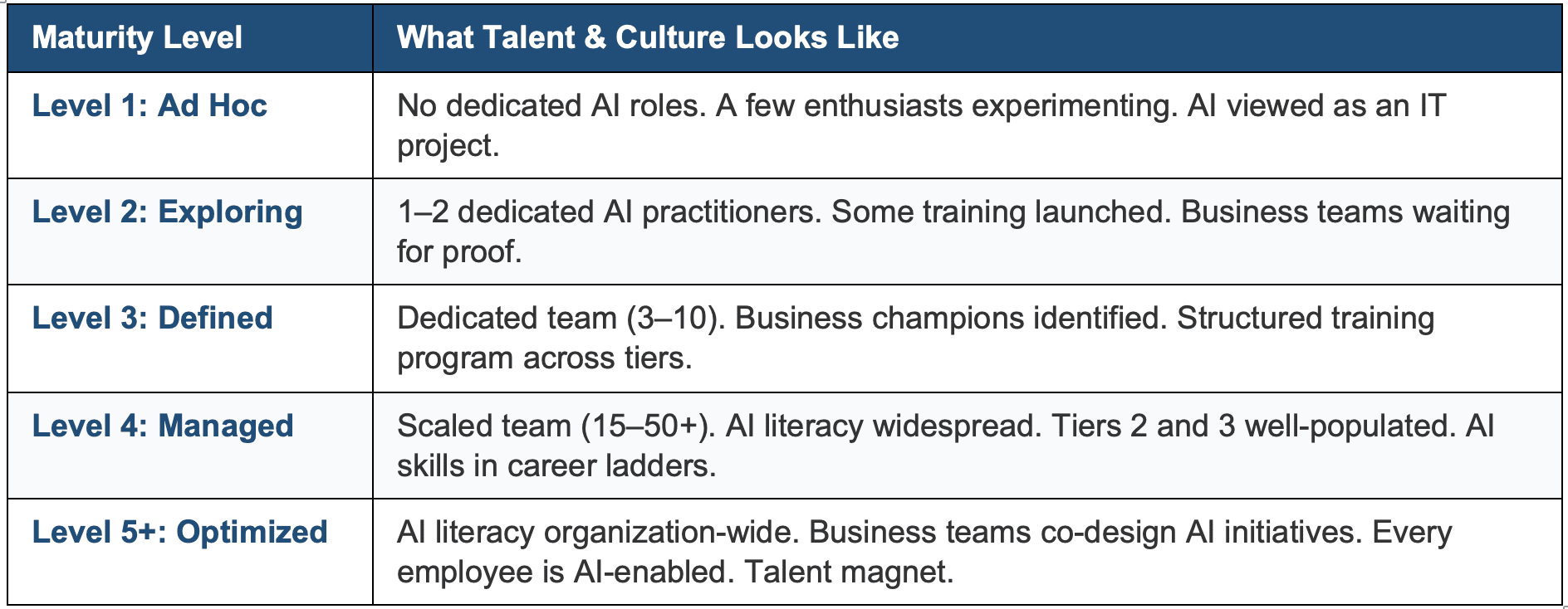Talent & Culture is Dimension 4 of the GenAI Maturity Framework. Here’s a quick diagnostic: