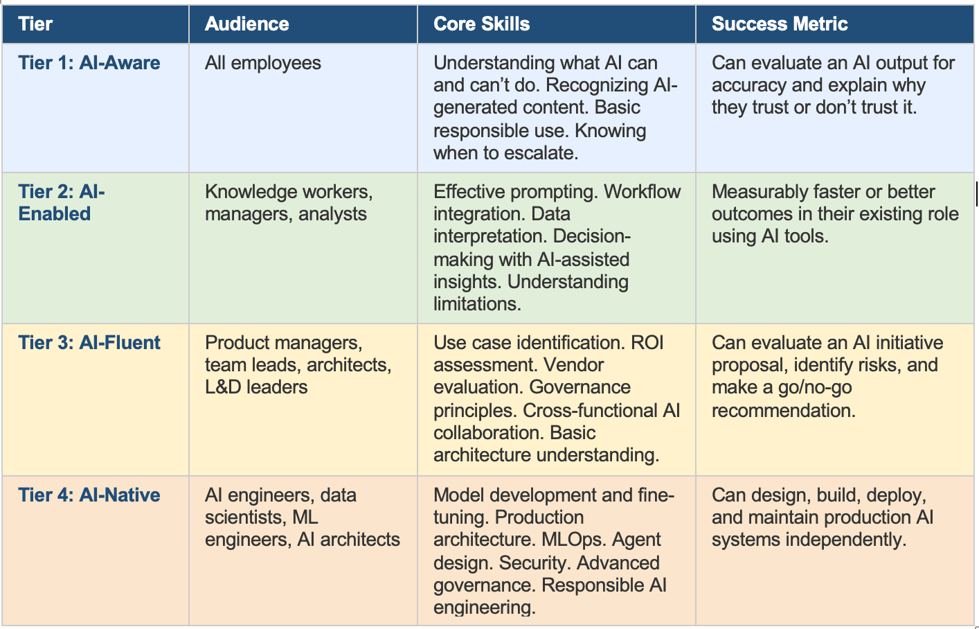 To solve this, I’ve developed a framework that maps AI skills across four tiers. Each tier has a different audience, skill set, and set of success metrics. The key insight: you need all four tiers functioning simultaneously, not sequentially.