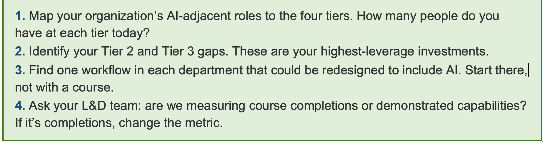 - Embed AI in Workflows, Not Just in Workshops